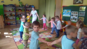 Ten dzień pełen był uśmiechu i dobrej zabawy. Dzieci uczestniczyły w zabawach z wykorzystaniem chusty animacyjnej oraz zmagały się z balonami. Przy dźwiękach muzycznych hitów barwnie i wesoło bawiły się wszystkie grupy przedszkolne. Warto dodać, że po raz pierwszy ze swoimi starszymi kolegami i koleżankami spotkały się nasze maluszki. Było to dla nich na pewno duże przeżycie znaleźć się wśród starszych przedszkolaków.