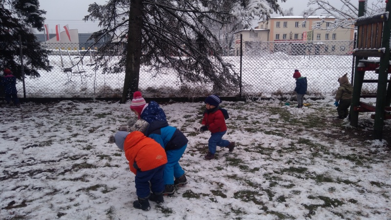 Tegoroczna zima płata nam figle, raz jest ciepło, a raz mroźno. Dlatego korzystając z jej uroku często bawimy się na śniegu w naszym przedszkolnym ogrodzie. Dzieci oddały się zimowemu szaleństwu, rzucając śnieżkami do siebie, a także "atakując" kulami śniegowymi swoje panie (oczywiście zachowując zasady bezpieczeństwa!).